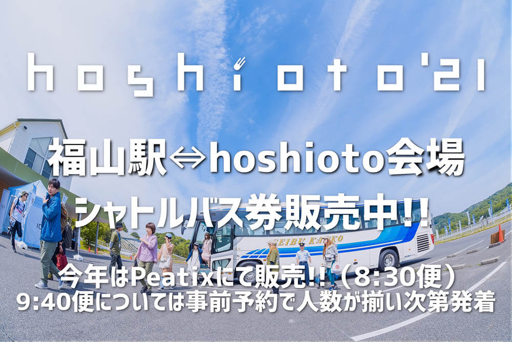 今年よりPeatixにて事前販売制となります。売り切れの場合は、予約を行い人数が達した時点で追加販売を行います。 シャトルバスチケット販売情報 販売価格往復 3,500円(税込)販売方法Peatixにて販売販売期間5/21(金)販売終了 福山駅⇔hoshioto会場往復券のご購入はこちら 8:30発便購入はこちら 9:40発便購入はこちら 詳細はこちら TICKET share URL Copied! URL Copied! 12/26(土) 一般チケット&キャンプチケット販売開始 JR福山駅 ⇔ hoshioto会場往復のシャトルバス9:40便発着決定!! 8:30便も増便!!